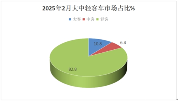 从占比看,大、中、轻客车占据2025年2月客车总销量的比例分别为10.8%、6.4%和82.8%;