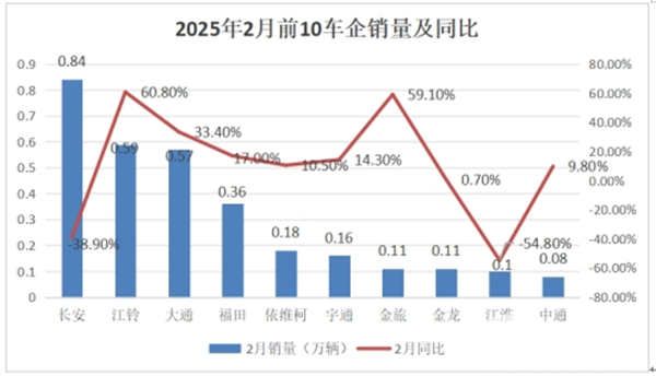 上图可见,在2025年1-2月大中轻客车累计销量中,长安、大通及江铃居前三。