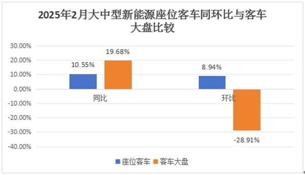 根据中国客车统计信息网数据,2025年2月我国大中型新能源座位客车同环比分别增长10.55%和8.94%,而今年2月大中型新能源客车大盘同环比分别为19.68%和-28.91%,可见今年2月大中型新能源座位客车同比跑赢、环比跑输大中型新能源客车大盘;