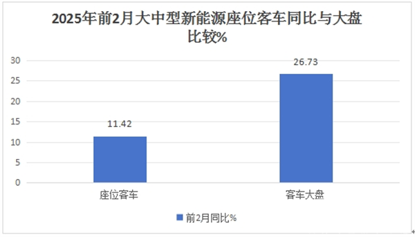 同时,2025年前2月大中型新能源座位客车累计同比增长11.42%,跑输2025年前2月大中型新能源客车大盘26.73%的同比增速。