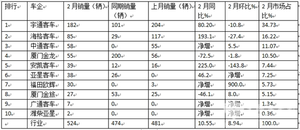 2月新能源座位客车:宇通\海格\中通排前三,安凯领涨