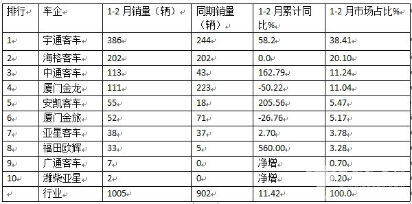 表2,根据中国客车统计信息网,2025年1-2月大中型新能源座位客车前10名车企销量排行及累计同比、市场占比: