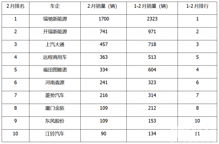 上表可见,无论是今年2月还是1-2月,新能源大面前三均为瑞驰新能源开瑞新能源上汽大通。