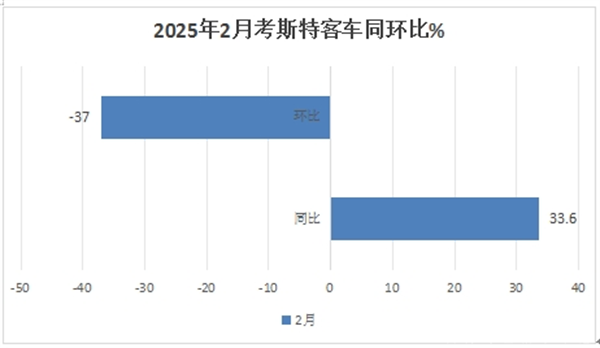 上图表显示,2025年2月考斯特客车同环比分别为33.6%和-37%,分别跑赢2月客车大盘18.35%的增幅和跑输客车大盘环比-21.54%的增幅。