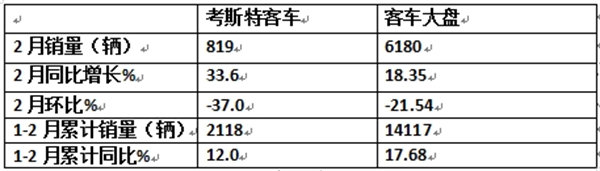 2月考斯特客车:同环比分别增减3成多,销量创近年同期新高
