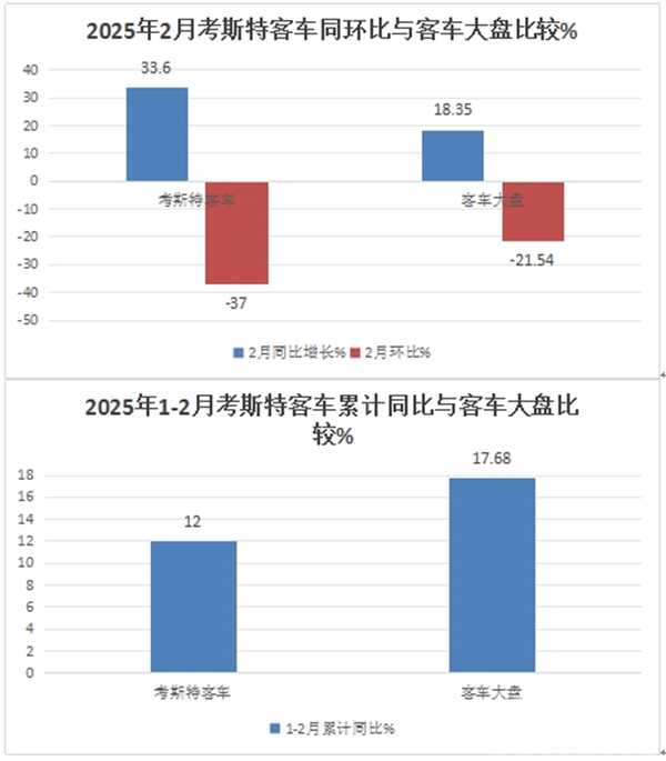 2025年1-2月考斯特客车累计同比增长12%,跑输2025年前2月大中型客车大盘17.68%的增速。