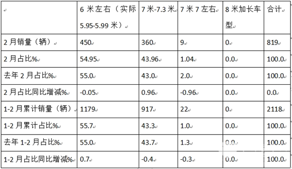 表2,根据上牌信息,2025年2月及1-2月考斯特客车按长度段车型划分销量结构: