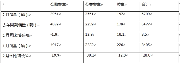 ---销量最大的是公路客车,销量3961辆,同比下降1.9%,成为唯一同比下降的细分市场而领跌大盘;据分析主要是去年同期销量基数较高,加之春节假期影响,人们出行需求在时间上分布不均;同时多元交通工具竞争加剧,一定程度上影响了今年2月公路客车的销量。