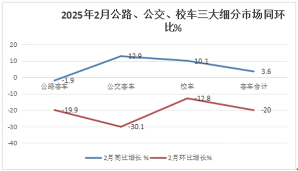 上图表可见,在2025年2月5米以上公路、公交、校车三大细分市场中: