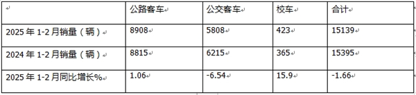 2025年1-2月5米以上客车累计销售15139辆,同比2024年1-2月15395辆下降1.66%;