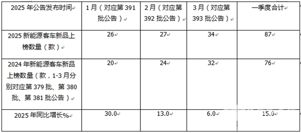 根据统计,截止到今年3月,2025年一季度工信部共计发布了3个批次(第391批—第393批)的新能源客车新品公告,累计上榜了87款新能源客车新品车型(含81款纯电动客车、5款燃料电池客车和1款插电式混动客车),比去年同期的76款增长15%。