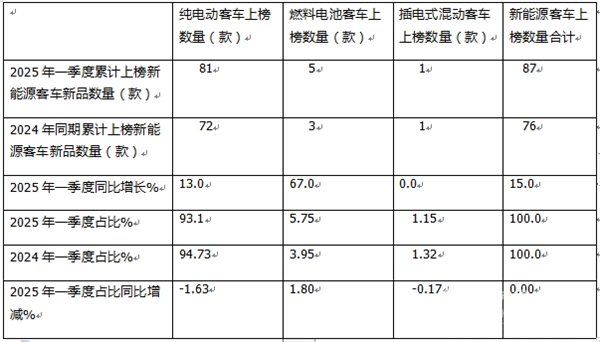 表1,根据工信部数据,2025年一季度新能源客车公告上榜的新能源客车新品数量与2024年同期比较: