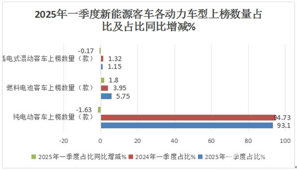 表2,根据工信部数据,按技术路线划分,2025年一季度新能源客车新品公告中上榜的各类车型数量与2024年同期比较: