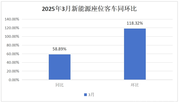 根据中国客车统计信息网数据,2025年3月我国大中型新能源座位客车同环比分别增长58.89%和118.32%,而今年3月大中型新能源客车大盘同环比分别为34.66%和83.08%,可见今年3月大中型新能源座位客车同环比均跑赢大中型新能源客车大盘;