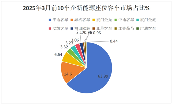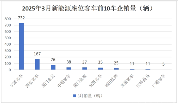 上图表可见,在2025年3月大中型新能源座位客车销量中: