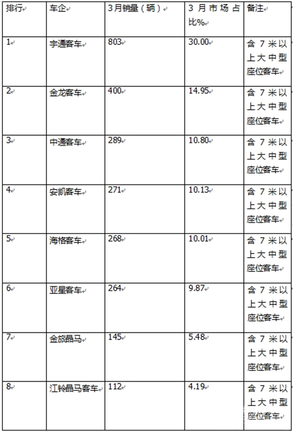 一、3月大中型座位客车排行:宇通夺冠,金龙\中通分列二三