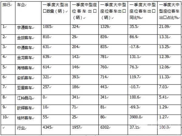 2025年一季度大中型座位客车及公交客车出口排行出炉