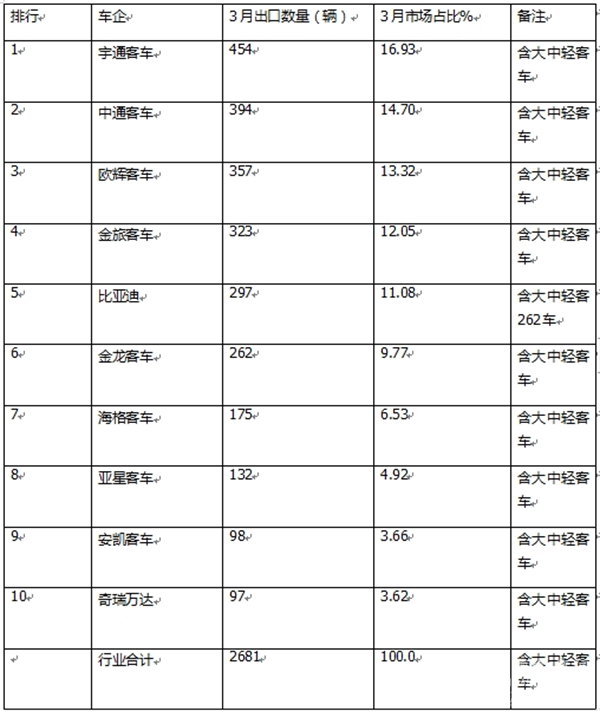 上表显示,在2025年3月我国大中型座位客车出口市场前10车企中: