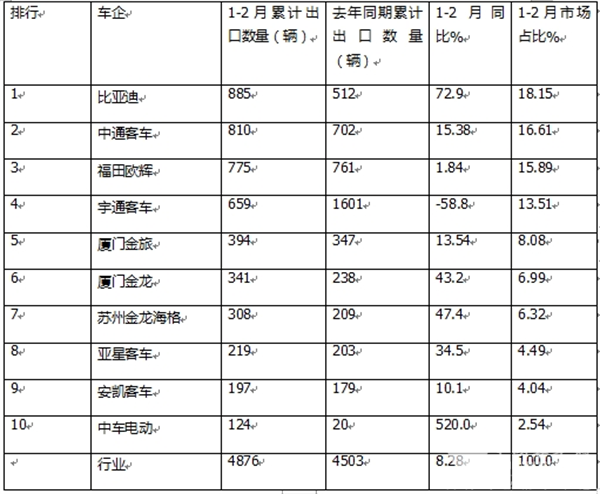 表4,根据中国客车统计信息网统计数据,2025年1-2月我国公交客车前10家车企出口排行如下表: