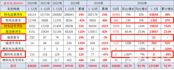 值得关注的是, 2025年3月我国新能源客车动力电池装机量大约为397MWh(将截图3中2025年3月份的纯电动客车装车量396MWh+2025年3月的插电式混动客车装车量1MWh+2025年3月的燃料电池客车的装车量0MWh) ,同比(2024年3月新能源客车装车量为179MWh)增长10%;2025年一季度新能源动力电池累计装机量大约为1323MWh,同比增长37%。