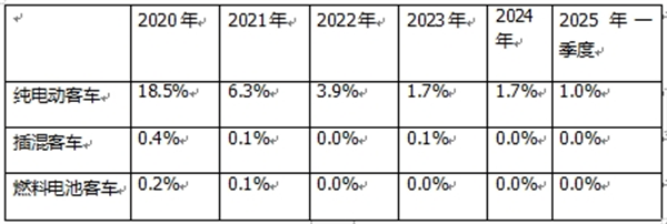 四、2025年一季度各技术路线新能源客车装机量同比及占比: