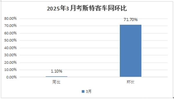 根据终端上牌数据,2025年3月,全国考斯特客车(含6米及以上,下同)销售1406辆,同比去年3月的1391微增1.1%;环比今年2月的819辆的大涨71.7%,可见今年3月考斯特客车市场呈现同比微增、环比大涨的趋势。