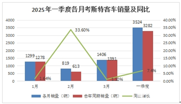 表1,根据终端上牌数据,2025年一季度各月考斯特客车销量及同比