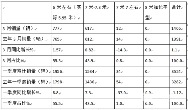 从同比增长看,6米段考斯特客车同比分别增长1.57%和8.8%,均领涨考斯特客车大盘。也就是说,无论是今年3月还是一季度,考斯特客车均领涨领跑考斯特客车市场大盘。