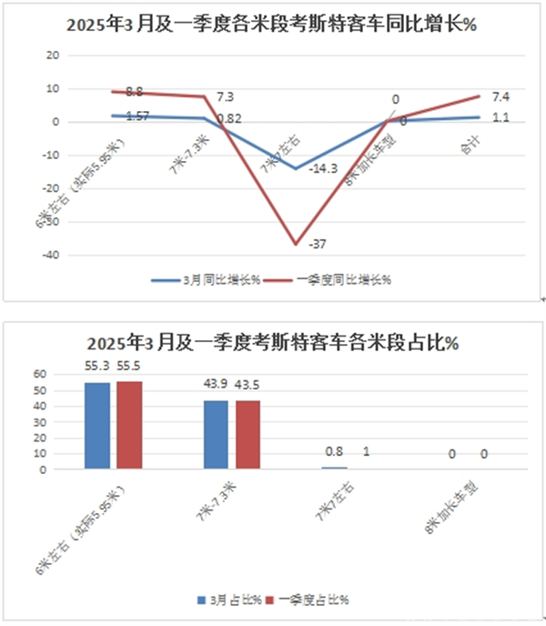 表1,根据上牌信息,2025年3月及一季度考斯特客车按长度段车型划分销量结构: