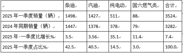 表2,根据终端上牌数据统计,按燃料种类划分,2025年一季度考斯特客车销量结构:
