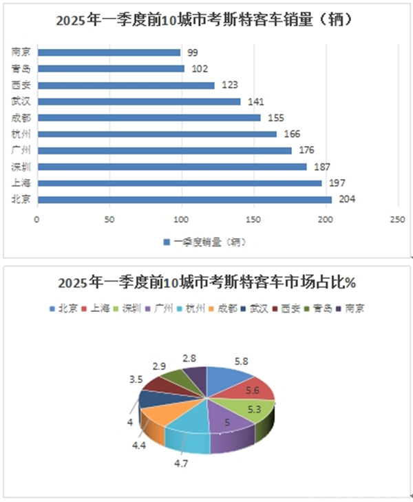 2025年一季度考斯特:销量创新高、纯电动领涨;北京\上海\深圳居前三