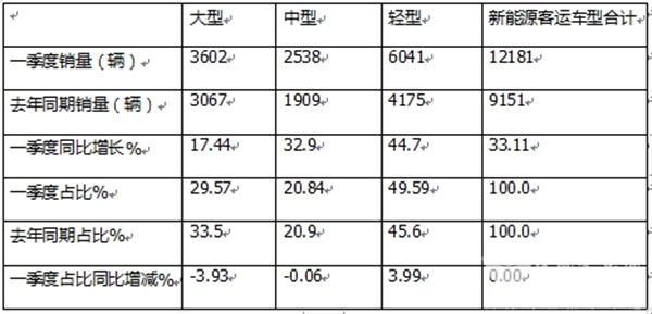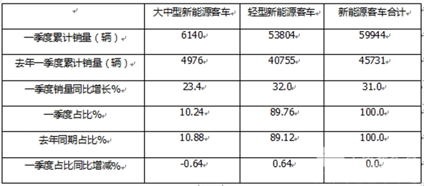 ---大中型新能源客车累计销售6140辆,同比增长23.4%;占据今年一季度国内新能源客车总销量10.24%的市场份额,占比同比减少0.64个百分点;