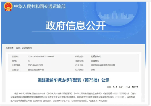 截图1,交通部道路运输车辆达标车型表(第75批公示):