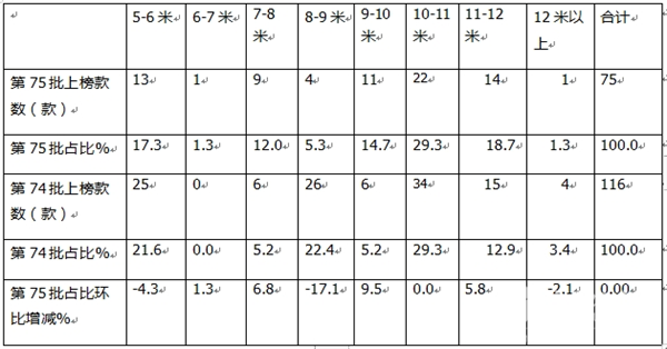 表2,根据交通部数据,第75批客车达标车型公告中上榜的各长度段车型数量、占比比及环比增减统计: