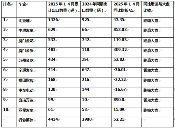上表显示,在2025年前4月新能源客车累计出口前10车企中: