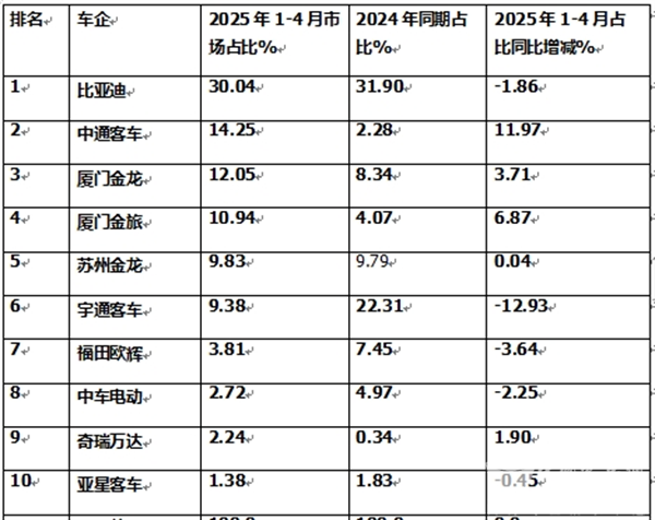 表4,根据中国客车统计信息网数据,2025年1-4月前10车企累计出口占比及占比同比增减: