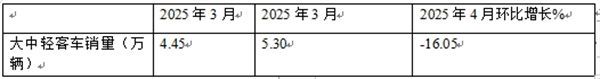 ---2025年4月我国大中轻客车环比下降16.05%,主要是因为今年3月销量基数较高,给今年4月销量环比增长带来困难;另外就是今年4月的市场景气度相对3月要差,市场大环境对客车的需求动力环比明显减弱。