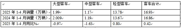 表4,据商用车专业委员会提供的批发数据,2025年1-4月大、中、轻客车累计销量同比: