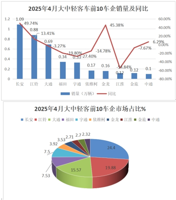 根据商用车专业委员会提供的批发信息,2025年4月我国大中轻客车前10车企销量及同比、占比: