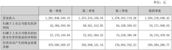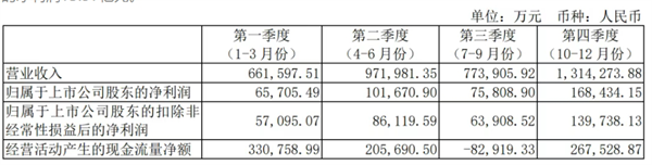 ---利润方面:2024年公司获得归属上市公司股东的净利润41.16亿元,同比增长126.53%,扣除非经常性损益的净利润34.69亿元,同比增长145.21%。其中:第一季度归属上市公司股东的净利润6.57亿元,扣除非经常性损益的净利润5.71亿元;第二季度归属上市公司股东的净利润10.17亿元,扣除非经常性损益的净利润8.61亿元;第三季度归属上市公司股东的净利润7.58亿元,扣除非经常性损益的净利润6.39亿元;第四季度归属上市公司股东的净利润16.84亿元,扣除非经常性损益的净利润13.97亿元。