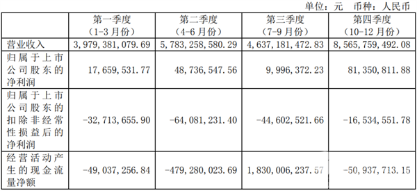 ---利润方面:2024年公司获得归属上市公司股东的净利润1.58亿元,同比增长110.05%,扣除非经常性损益的净利润亏损1.58亿元。其中:第一季度归属上市公司股东的净利润0.18亿元,扣除非经常性损益的净利润亏损0.33亿元;第二季度归属上市公司股东的净利润0.49亿元,扣除非经常性损益的净利润亏损0.64亿元;第三季度归属上市公司股东的净利润0.1亿元,扣除非经常性损益的净利润亏损0.45亿元;第四季度归属上市公司股东的净利润0.81亿元,扣除非经常性损益的净利润亏损0.17亿元。