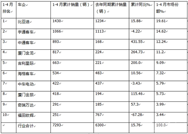 四、1-4月累销:比亚迪、宇通、金龙居前三 ;TOP10累计同比7增3降,中通领涨