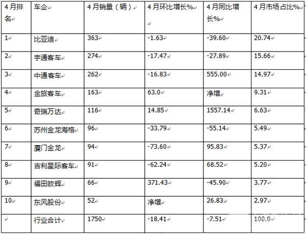 总之,在今年4月7米以上新能源公交客车市场竞争格局中,比亚迪夺冠,宇通\中通分列二三,TOP10销量同比8增2降,奇瑞万达客车领涨(暴涨1557.14%);环比4增6降,福田欧辉领涨(暴增371.43%)。