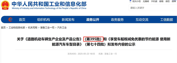 2025年5月23日,工信部发布关于《道路机动车辆生产企业及产品公告》(第395批公告,下也称“本批次公告”),这是2025年以来工信部发布的第5个批次的汽车新车产品公告。
