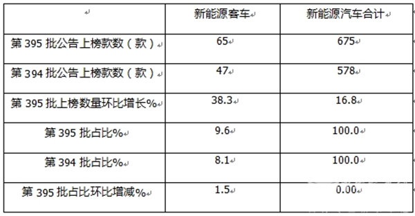 表1,根据工信部数据,第395批新能源汽车公告中各大类车型上榜数量及环比增长、占比及占比环比增减: