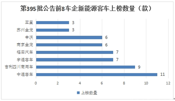在第395批公告中有多个客车品牌企业参与了新能源客车新品申报,各个品牌上榜数量统计如下:上榜数量在3款及以上的车企品牌统计如下: