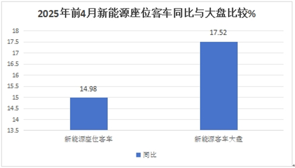 同时,2025年前4月大中型新能源座位客车累计同比增长14.98%,也跑输2025年前4月大中型新能源客车大盘17.52%的同比增速。