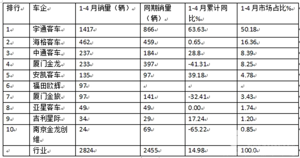 ---厦门金龙客车累计销量233辆,居第四,累计同比下降41.31%,市场占比8.25%;居第四;