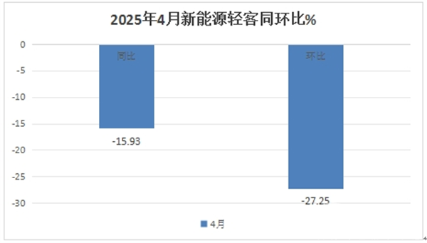 根据终端上牌数据,2025年4月国内新能源轻客销售18477辆,同比下降15.93%,环比下降27.25%。可见今年4月我国新能源轻客市场遭遇了同环比“双降”遇冷,新能源轻客今年的“银四”市场落空!
