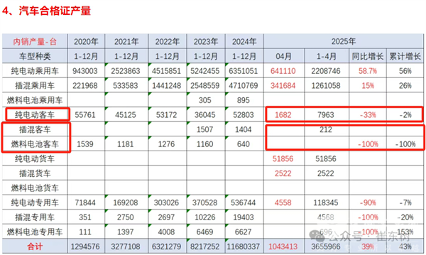 截图3,2025年4月及前4月各技术路线新能源客车装机量及同比(数据来源:中国汽车流通协会)